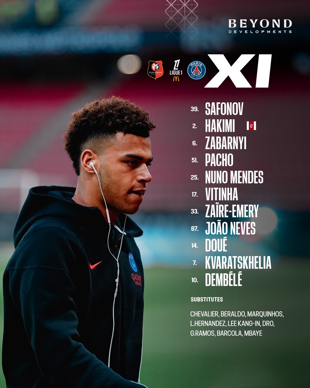 巴黎首发:39-萨福诺夫、2-阿什拉夫、6-扎巴尔尼、51-帕乔、25-努诺-门德斯、33-扎伊尔-埃梅里、17-维蒂尼亚、87-若昂-内维斯、14-杜埃、7-克瓦拉茨赫利亚、10-登贝莱