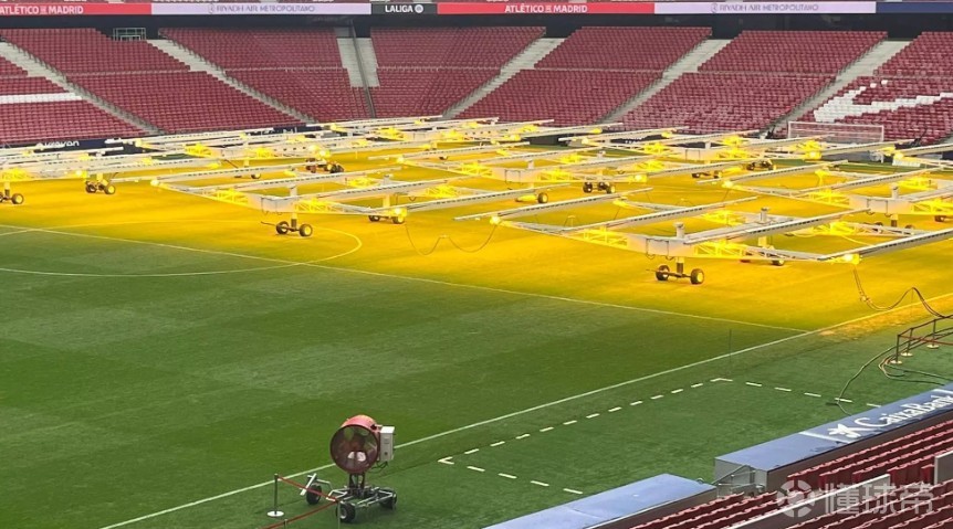 目前距离马竞对阵巴萨的首回合比赛仅剩48小时左右,球场内近一半区域覆盖着生长灯——这类模拟阳光的灯具常被用于高水平草坪的维护。2024年起,大都会球场开始使用Hatko Hybridgrass,这是一种新一代混合草皮,由西班牙公司Royalverd负责安装并提供技术支持。